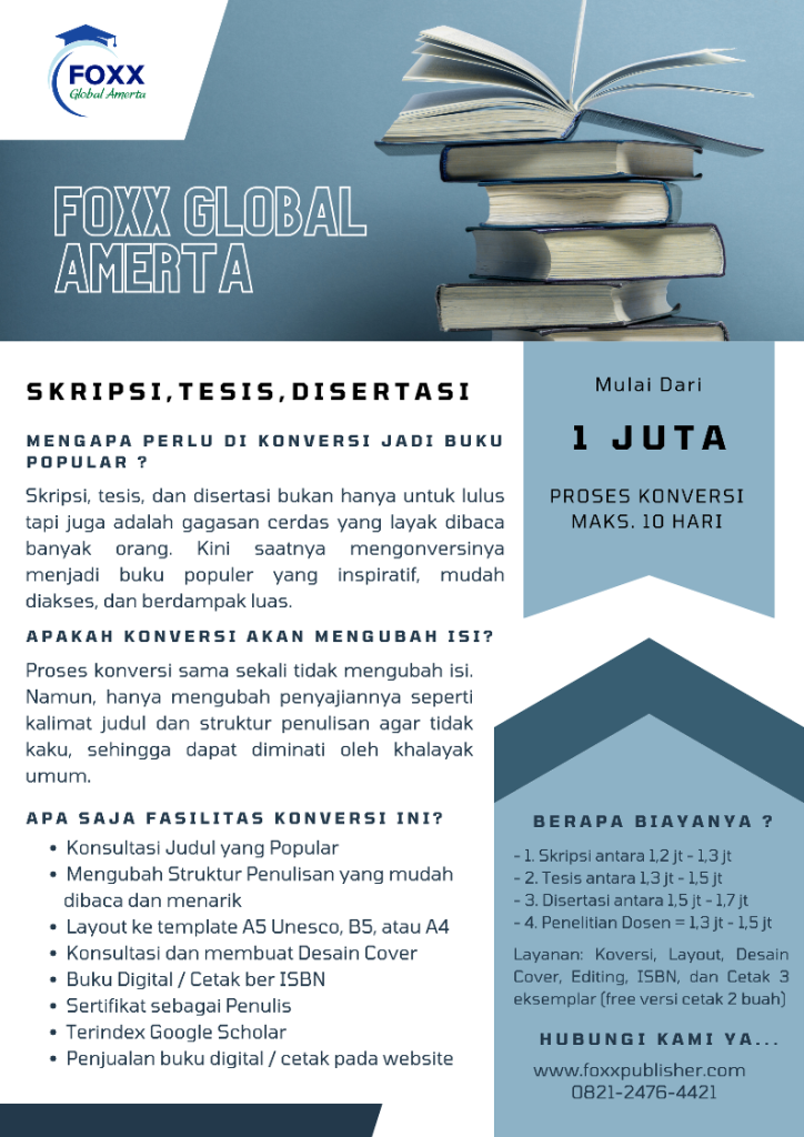 5. Konversi KTI menjadi Buku mencakup layanan Konversi Karya Tulis Menjadi Buku Ber-ISBN, kami membantu Anda mengubah karya tulis ilmiah menjadi buku resmi yang layak terbit dan terdaftar secara legal di Perpustakaan Nasional. Dengan demikian, karya Anda tidak hanya menjadi dokumentasi pribadi, tetapi juga bagian dari literatur ilmiah nasional yang dapat dikutip, dibaca, dan disebarluaskan lebih luas.